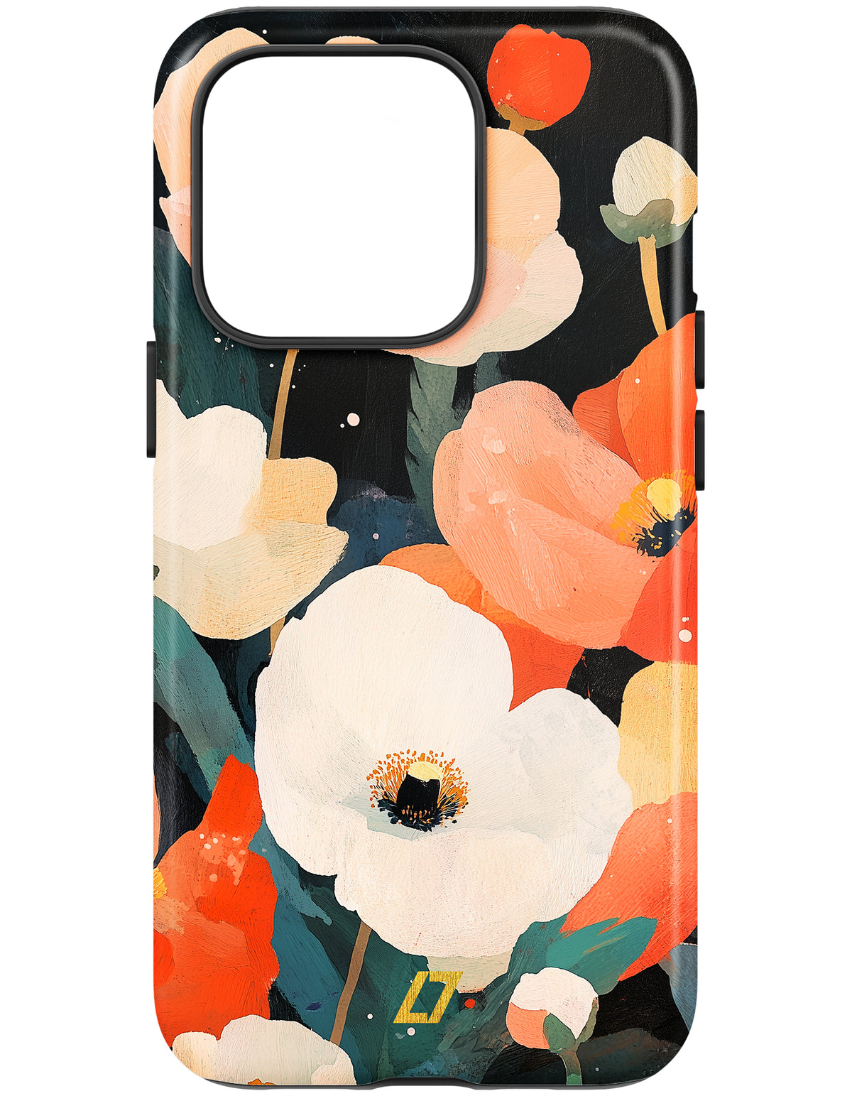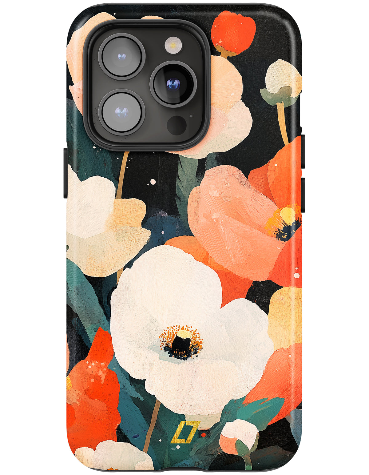 The Ethereal Bloom iPhone case brings a lively blend of abstract florals in bold, expressive colors on a deep, dark background. This artistic piece offers striking elegance and robust protection, ideal for those who appreciate modern floral aesthetics.